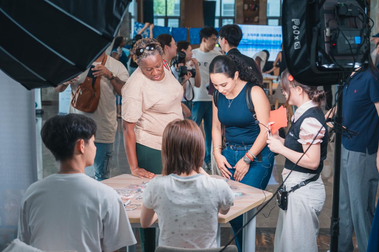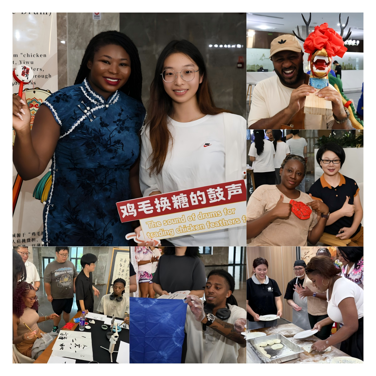 参观结束之后,外宾前往望湖楼直观感受体验学院的文化氛围与义乌的非遗特色。学院APEX舞社以热情洋溢的街舞表演开场,并邀请外宾共同参与,现场气氛热烈。外宾还分组体验了扎染、剪纸、板凳龙、书法等非遗项目,并在“拨浪鼓”展区聆听义乌从鸡毛换糖摇到全球小商品市场的创业历程。美食制作区中,外宾亲手尝试制作东河肉饼和佛堂千张面,品尝了红糖、义亭月饼等本地特色食品。此外,AI数字电商社展示了直播电商的活力,吸引了外宾交流互动。全场活动展现了传统与现代在校园中的交融共生,充分体现了传统文化的博大与包容。