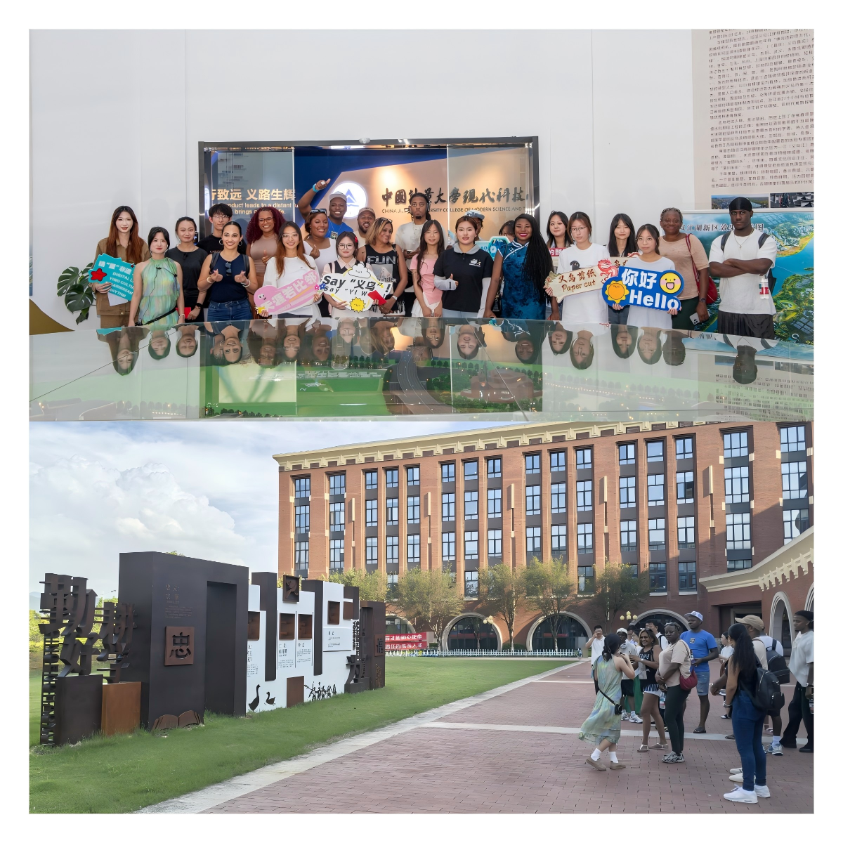 外宾首先参观了崇文楼“量行致远、义路生辉”办学成果主题展。学生讲解员从学院办学历程、社会关怀、取得成就等多个方面进行了详尽介绍,使外宾对我院有了全面的了解。随后,在“义乌六义文化墙”前,外宾了解了“六义”的含义,对义乌深厚的人文底蕴和鲜明的价值追求表现出浓厚兴趣。